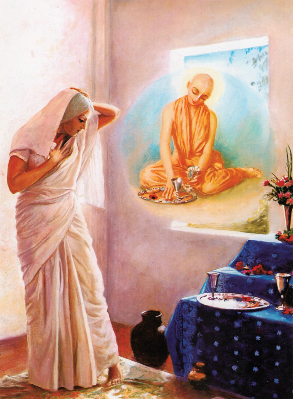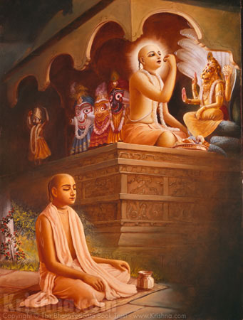 For example, Śrī Śacīmātā offered food at home to Śrī Caitanya Mahāprabhu although He was far away in Jagannātha Purī, and when she opened her eyes after offering the food she saw that it had actually been eaten by Śrī Caitanya Mahāprabhu. Similarly, when Śrīvāsa Ṭhākura performed saṅkīrtana, everyone felt the presence of Śrī Caitanya Mahāprabhu, even in His absence. This is another example of āvirbhāva. [56]